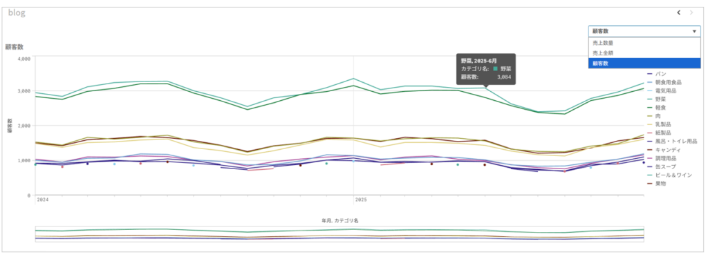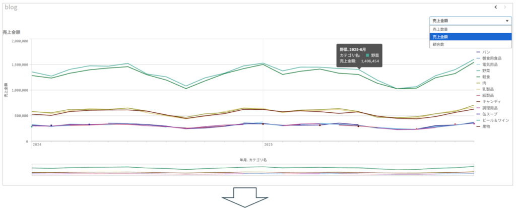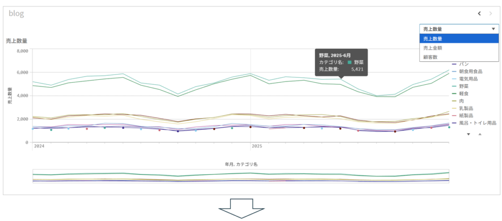 今回ご紹介したドロップダウンで指標切り替えする方法で「売上も、件数も、顧客数も見たい」といった要望のたびに膨れあがるチャート数を1チャートで完結できるので画面がすっきりして見やすく指標追加も容易になります。