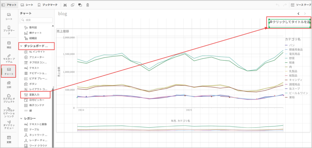 チャートのダッシュボードから変数入力をドラッグ&ドロップでシートへ設置します。