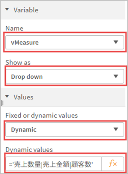 設置した変数入力をクリックし、Variableへ先ほど作成しました「vMeasure」をNameに設定、Show asは「Drop down」を選択し、ValuesのFixed or dynamic valuesで「Dynamic」を選択し、表示させたい項目名、売上数量、売上金額、顧客数を「|」で区切ってDynamic valuesへ文字列で入力します。