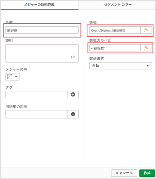 名前:顧客数、数式:Count(Distinct 顧客ID)、数式ラベル:=’顧客数’