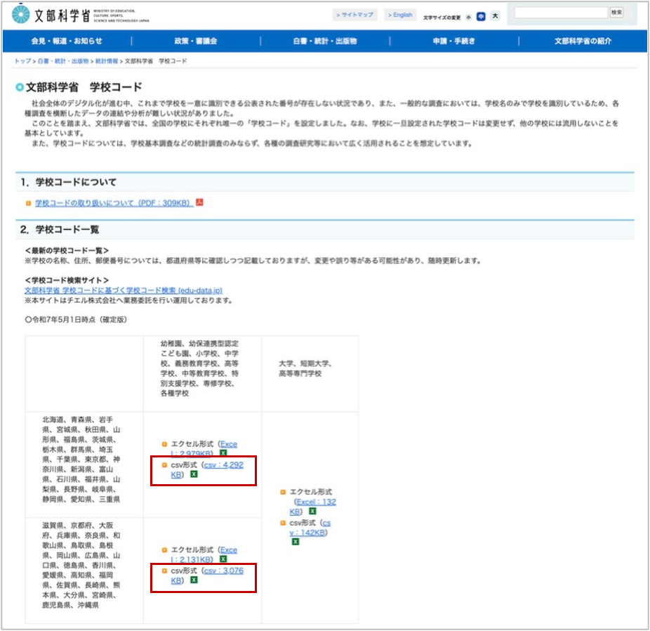 今回は文部科学省の全国の学校コードのリストを取得します。