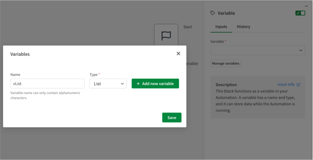 Loopブロックを追加し、Loop over items of listに上記のvListを指定します。これで、順番に変数の値を取得できるようになります。