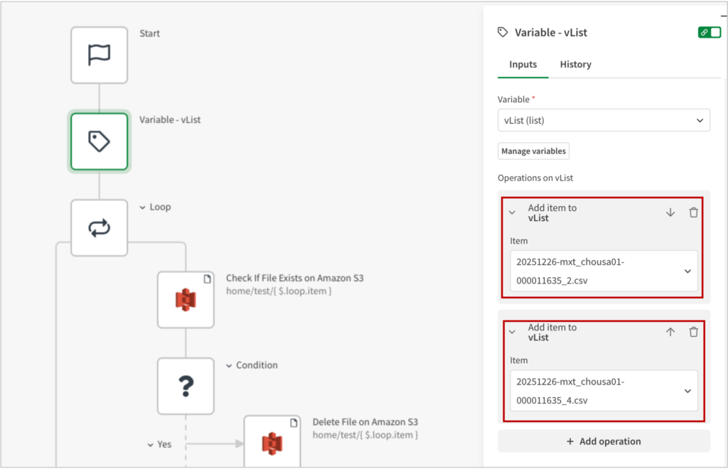 Variableブロックで、vList(list)を定義し、vListにファイル名を2つ格納しておきます。