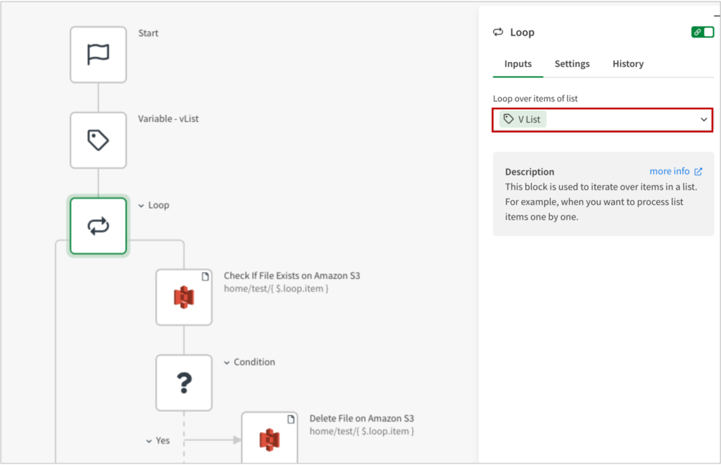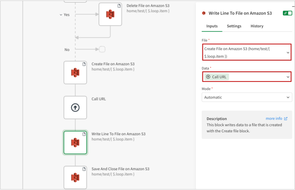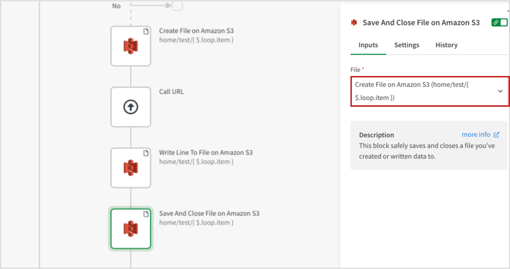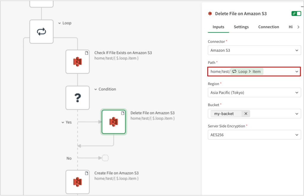 Amazon S3の[Create File on Amazon S3]ブロックを追加し、Pathに、home/test/Loop > itemと設定します。