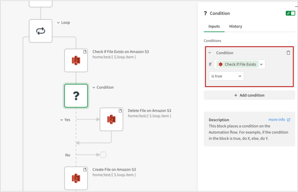 Conditionブロックを追加し、上記の[Check If File Exists on Amazon S3]が、”is true”という条件分岐とします。