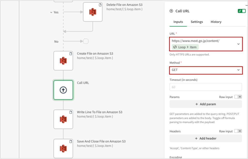 URLには、ファイル名を除くURL(ここではhttps://www.mext.go.jp/content/)に続けて、[Loop > item]を設定します。Methodは”Get“とし、あとはデフォルト設定で構いません。