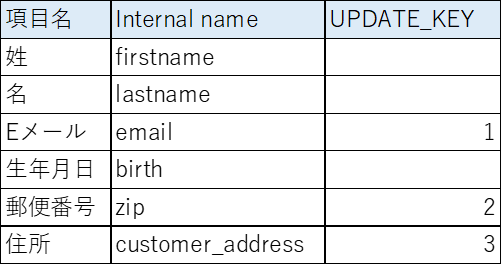例えば、とある顧客についてEメールが『test@mail』、郵便番号が『1000000』、住所が『東京都』だった場合、UPDATE_KEYは『test@mail-1000000-東京都』となります。