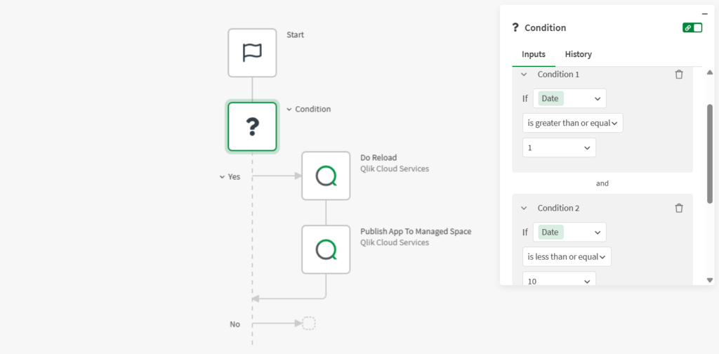 今回は、日付が1~10日の間であれば、指定したアプリのリロードをまわし、管理スペースに公開するというQlik Automateを作成します。