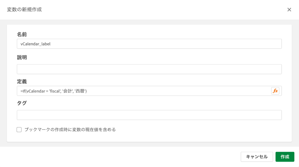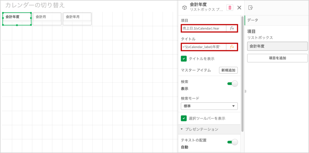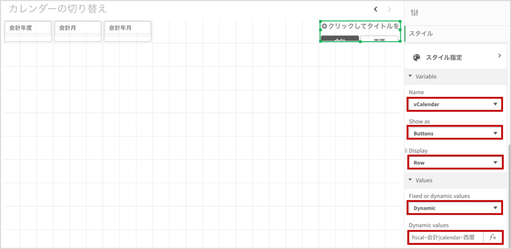 | vCalendar_label | =If(vCalendar = ‘fiscal’, ‘会計’, ‘西暦’) |