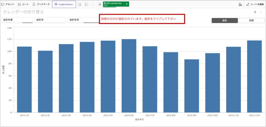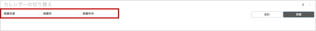 「年度」「月」「年月」3つのフィルターパネルが、ボタン切り替えに連動して「会計」と「西暦」に切り替わることが確認できるはずです。