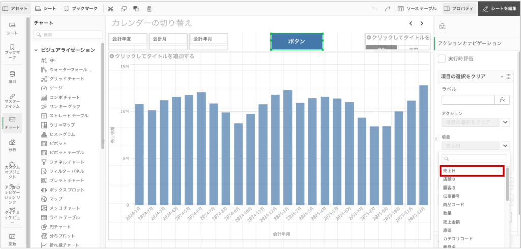 | 軸 > 項目 | =[売上日.$(vCalendar).YearMonth] |