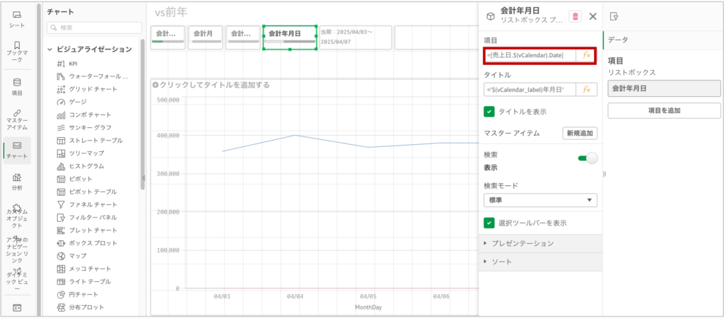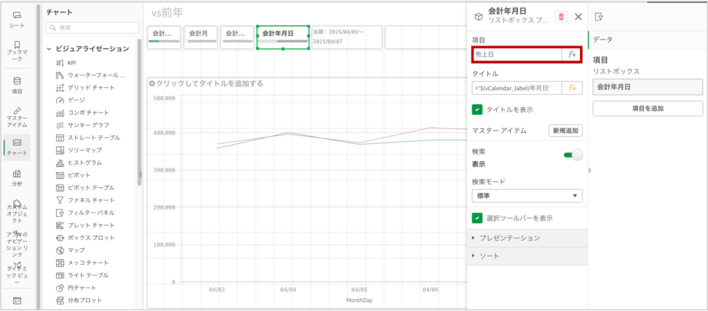 今回は売上日の派生項目である[売上日.$(vCalendar).Date]を使用してみます。