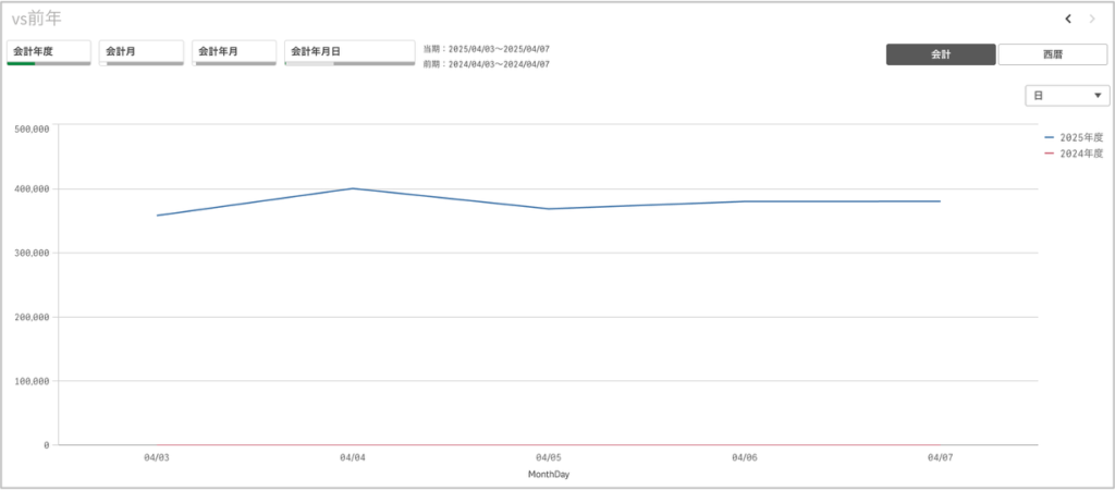 売上日の期間を選択してみますと、売上日の指定で前年もうまく表示されているようです。この仕様はフィルターパネルと同じですね。