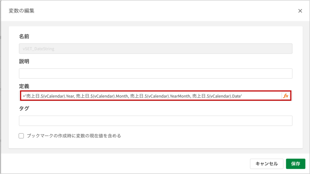 因みに、ここでは vSET_DateString の定義から 売上日.$(vCalendar).Date を外しています。