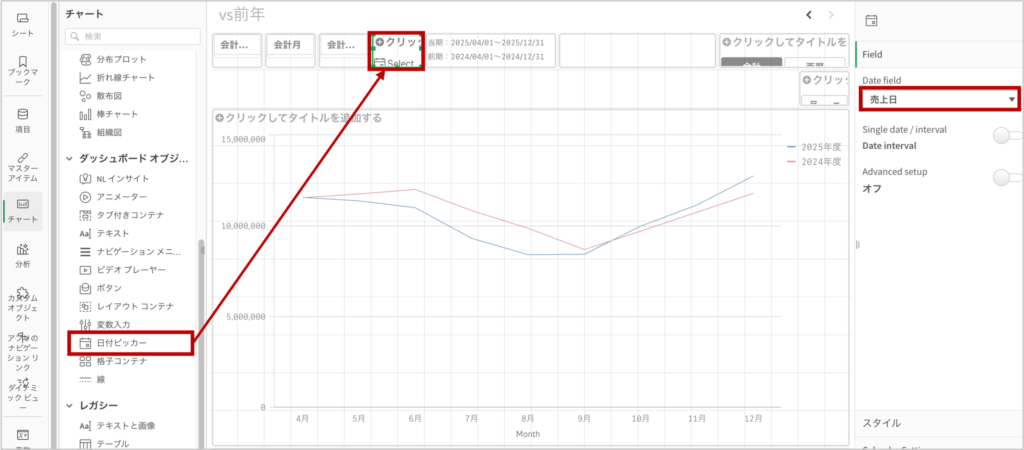 ダッシュボードオブジェクトの日付ピッカー(Date Picker)をシート上に配置します。