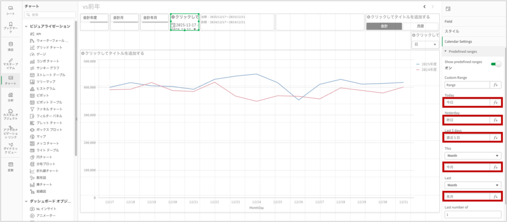 従って、前年の数式で使用されている変数 vSET_DateStringに売上日.$(vCalendar).Dateを追加してあげれば、問題なく表示できるようになります。