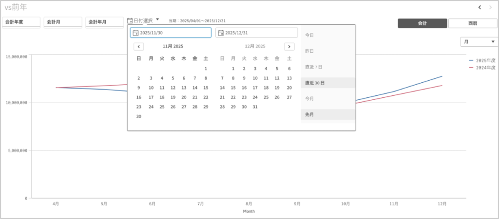 上記で定義したStart dateは、最大の日付(End date = Max(売上日))の1ヵ月前をカレンダー表示の開始日としていますので、直近の月はカレンダーの右側、前月がカレンダーの左側にデフォルト表示されます。このほうが期間を指定しやすくないですか?