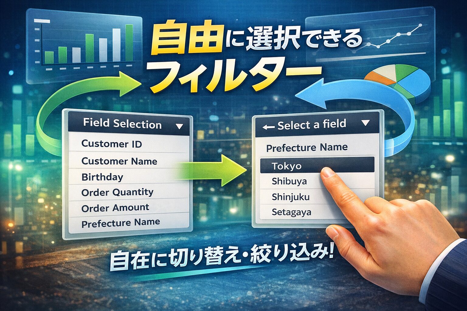 どのフィールドでも自由に選択して絞り込みできるフィルターの作成方法をご紹介します。
