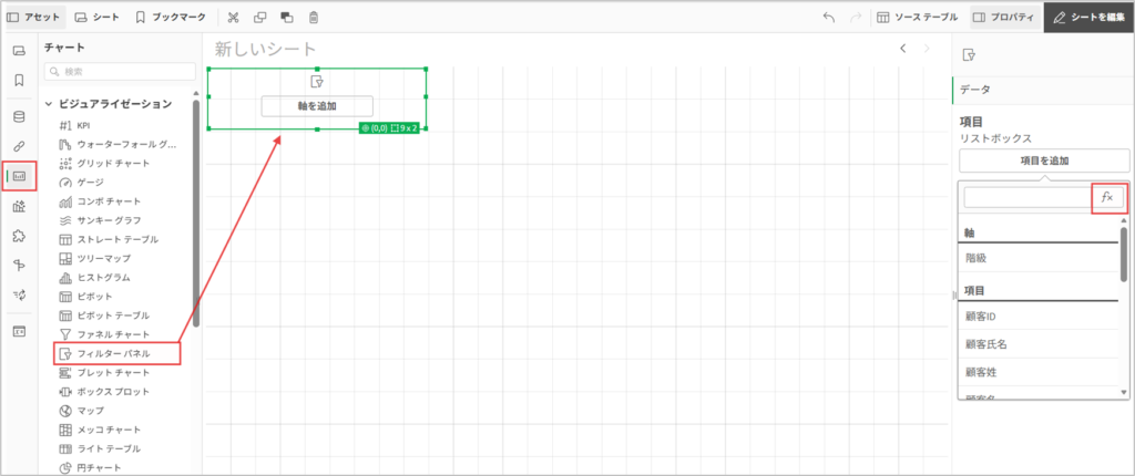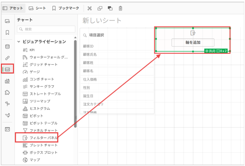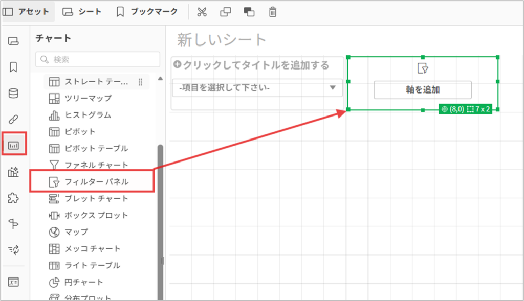 フィルターパネルを左側プロパティパネルのチャートからシートへドラッグ&ドロップします。