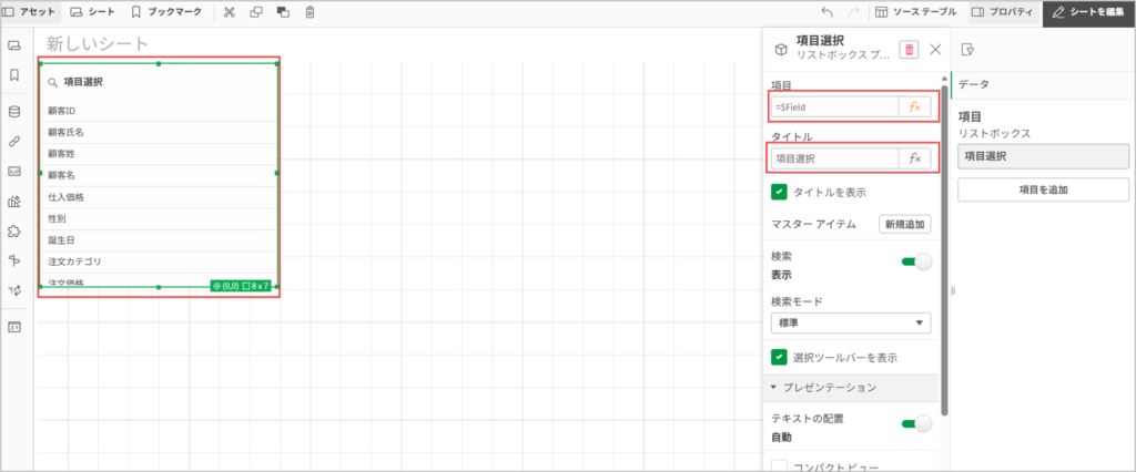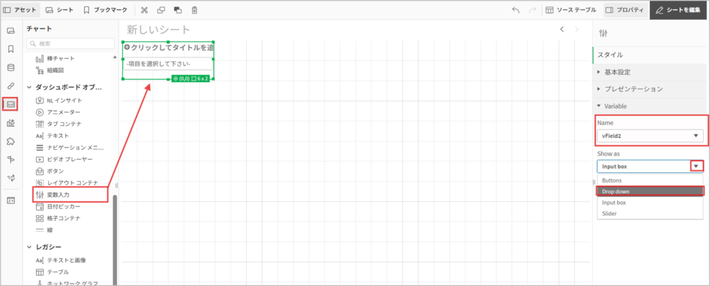 シート上の変数入力を選択し、プロパティパネルのVariableのNameで先ほど作成しました変数「vField2」を選択しShow as は「Drop down」を選択します。