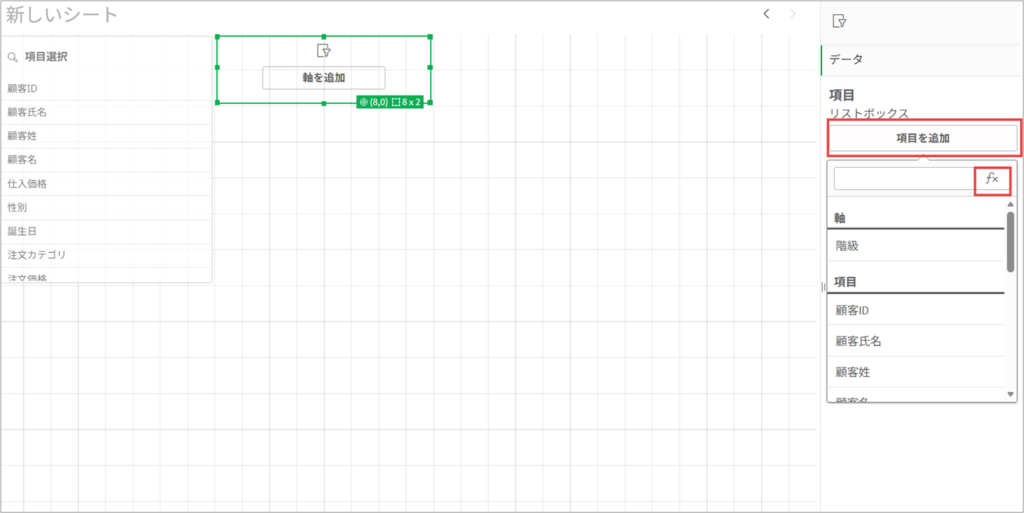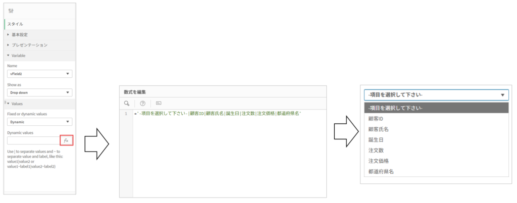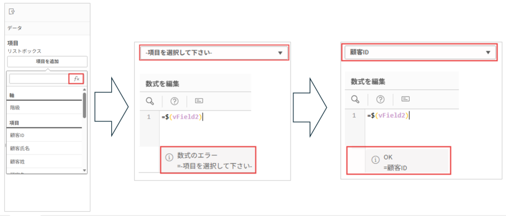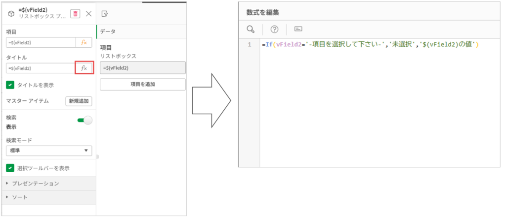シート上のフィルターパネルを選択し右側プロパティパネルで項目を追加をクリックし[fx]ボタンをクリックし数式の編集で=$(vField2)を設定します。