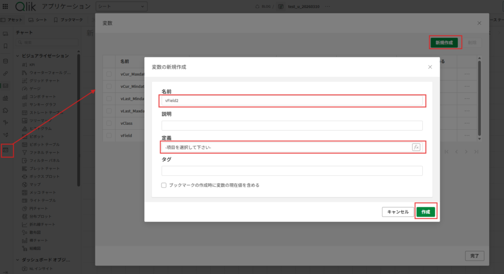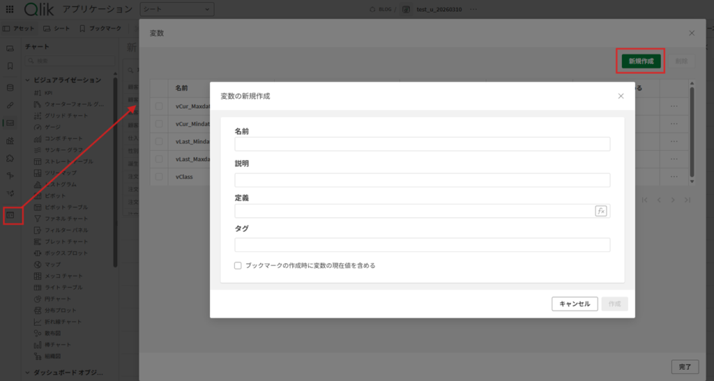 左側プロパティパネルの変数ボタンをクリックし、変数の新規作成をクリック