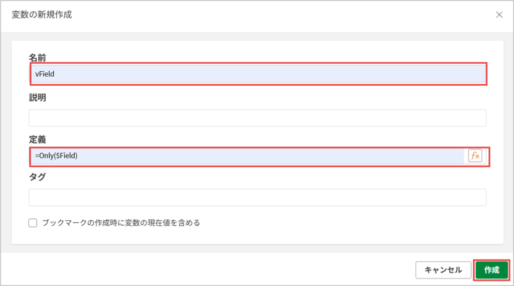 次のフィルター作成時必要になる変数(vField)を作成します。