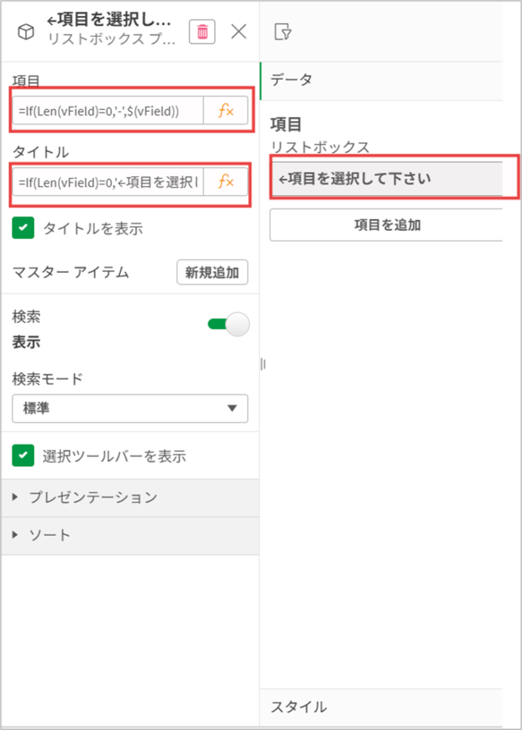 タイトルに、=If(vField2=’-項目を選択して下さい-‘,’未選択’,’$(vField2)の値’)を設定します。