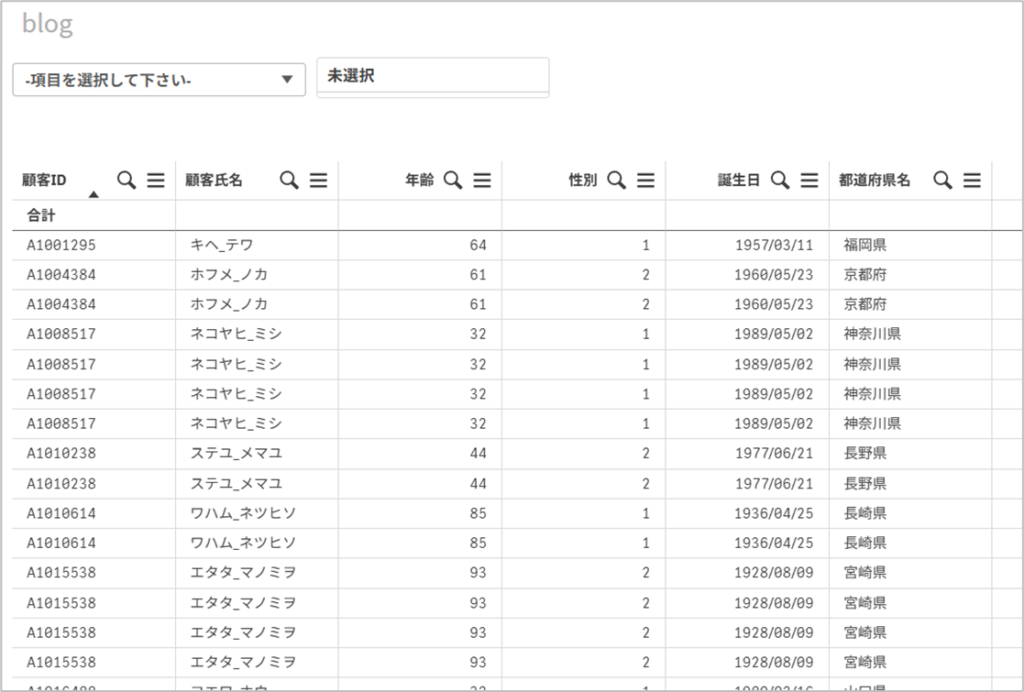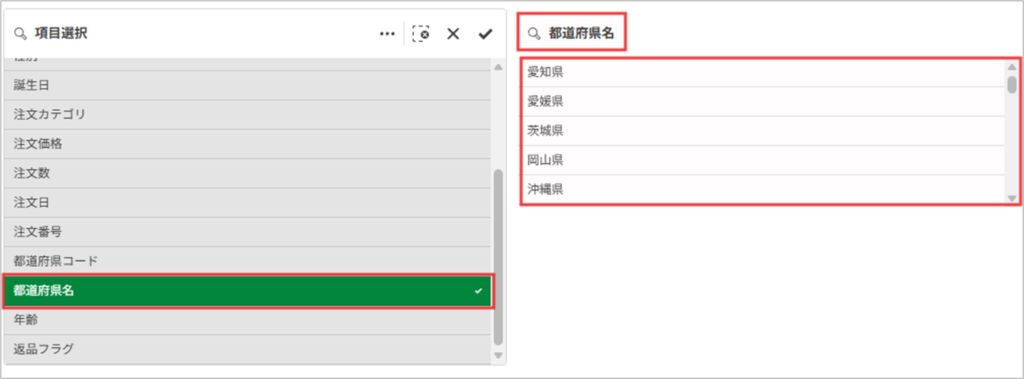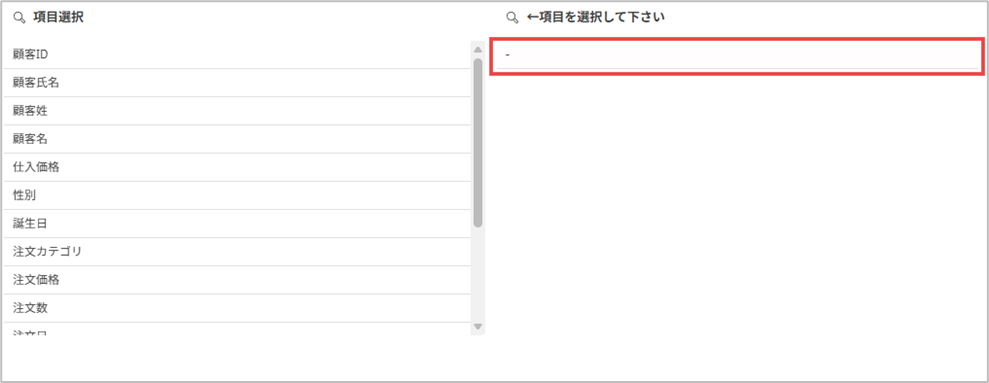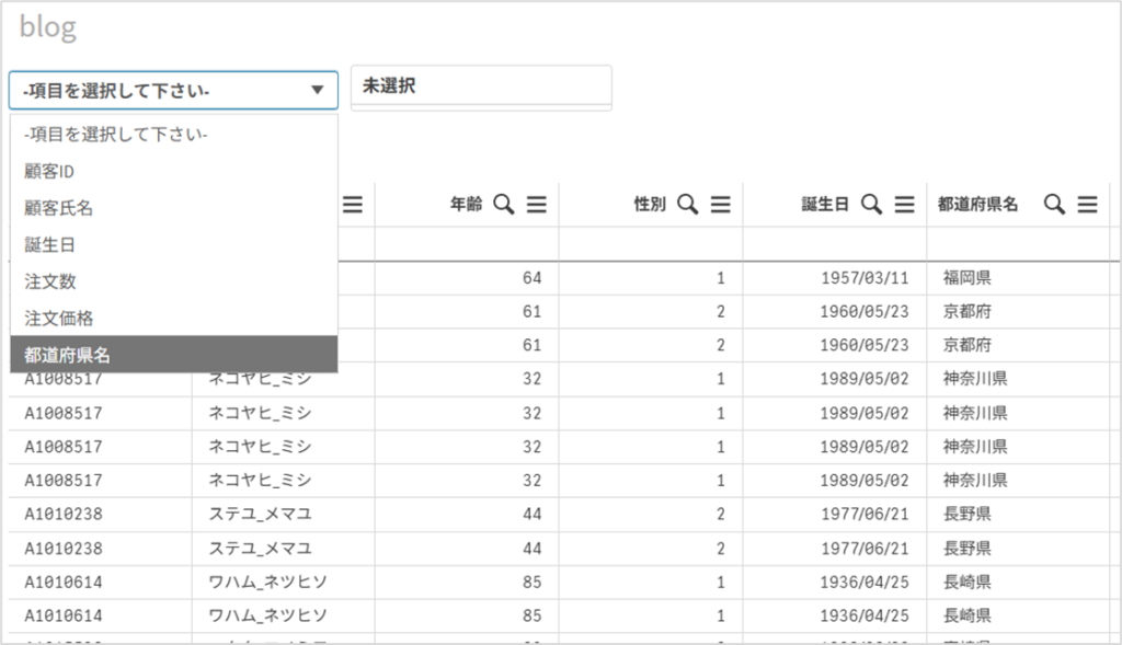 =’-項目を選択して下さい-|顧客ID|顧客氏名|誕生日|注文数|注文価格|都道府県名’
