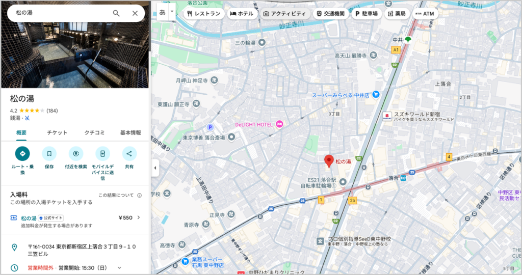 都内には松の湯が5つあるので、どこか識別できないのかな?公式ドキュメントではstarbucksの場所が検索できていたのに…