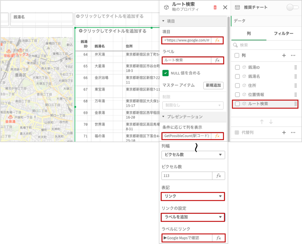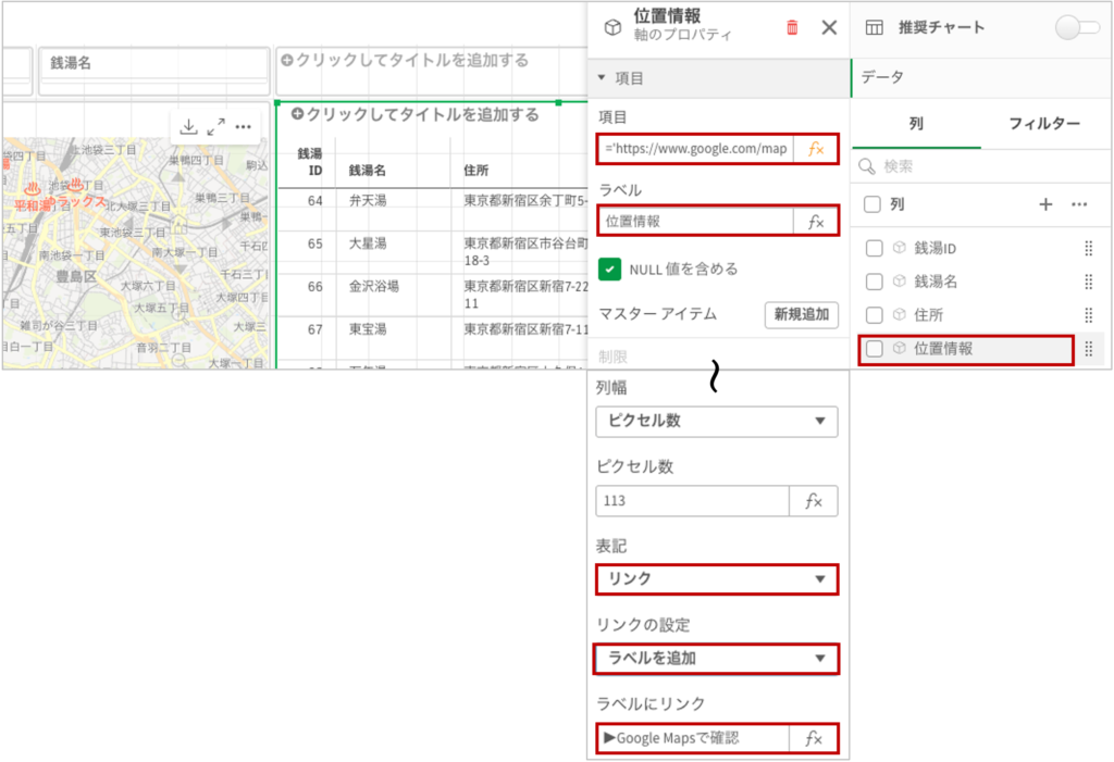 Qlikのレイヤ表示で銭湯マップをつくってみる(その3)で作成したマップの横に配置したストレートテーブルに列を追加していきます。