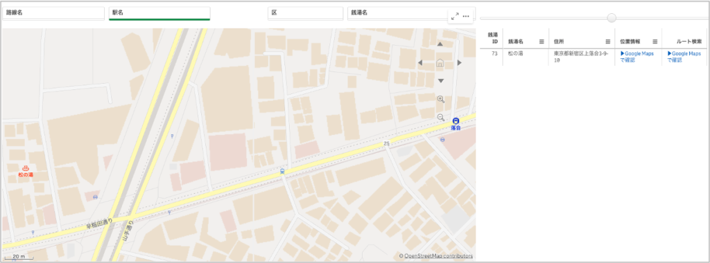おそらく、銭湯の緯度経度は微妙なズレがあることを考えると始点を緯度経度、終点を住所としたいところです。