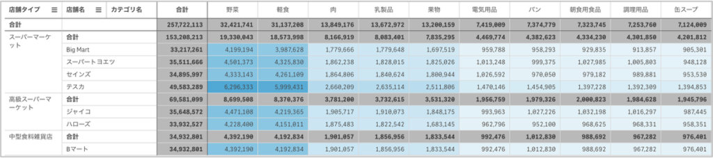 Dimensionality()が2を返してくる場合は売上を表示していますが、Dimensionality() = 0のときは店舗タイプの合計行Dimensionality() = 1の時は店舗の合計行です。