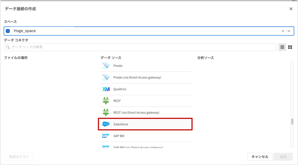 接続を作成するスペースを指定した上で、データソースからSalesforceを選択します。