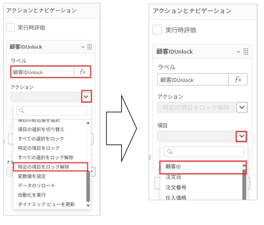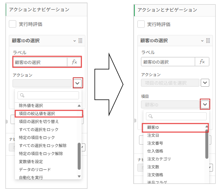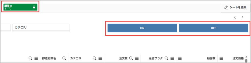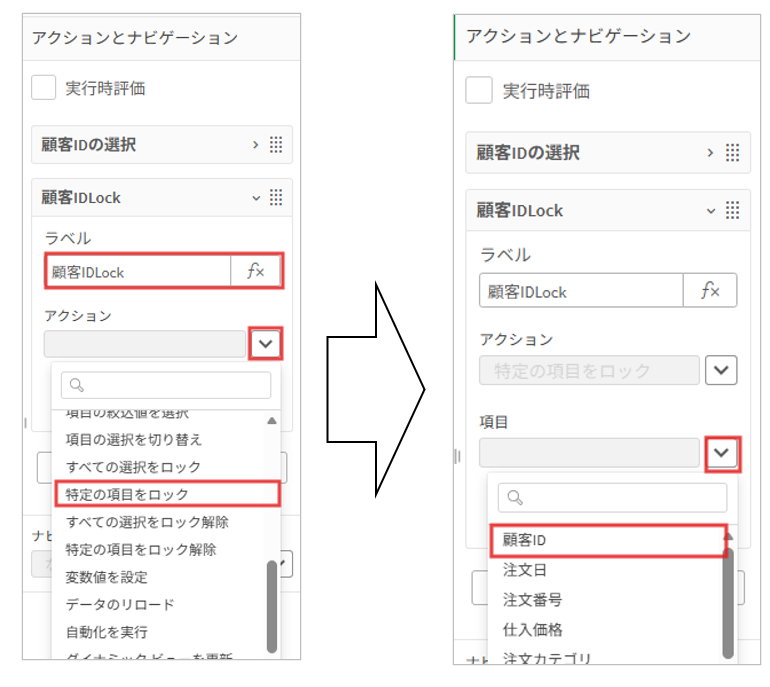 Lock対象の設定です。ONボタンのチャートを選択、右のプロパティパネルのアクションとナビゲーションを選択しアクションの追加をクリック、ラベル名を「顧客IDの選択」としアクション欄の横の∨マークをクリック後ドロップダウンから「特定の項目を絞り込み」を選択、項目欄も∨マークをクリック後ドロップダウンから「顧客ID」を選択します。
