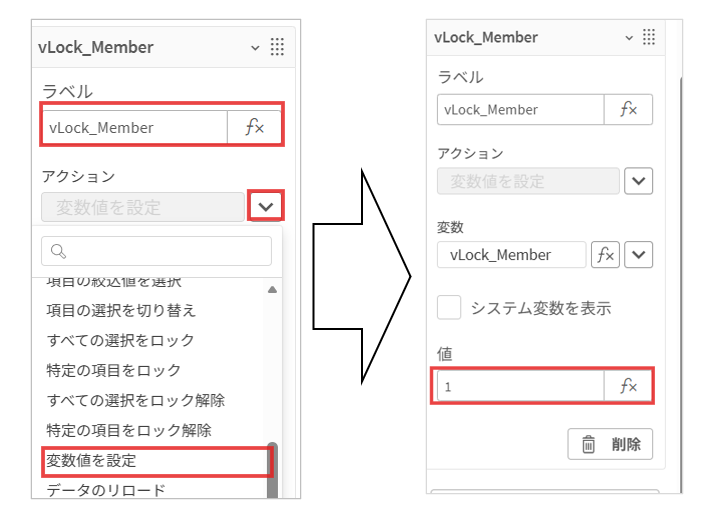 アクションの追加をクリック、ラベル名を「顧客IDLock」アクション欄の横の∨マークをクリック後ドロップダウンから「変数値を設定」を選択し、変数欄の横の∨マークから最初に作成したvLock_Memberを選択し値に「1」を設定します。