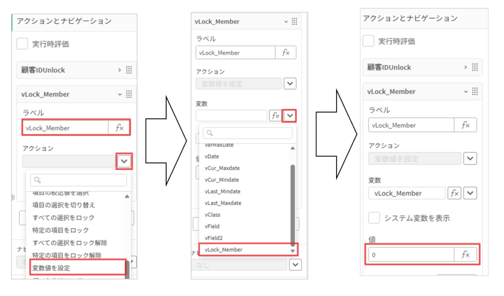 アクションの追加をクリック、ラベル名を「顧客IDLock」アクション欄の横の∨マークをクリック後ドロップダウンから「変数値を設定」を選択し、変数欄の横の∨マークからvLock_Memberを選択し値に「0」を設定します。