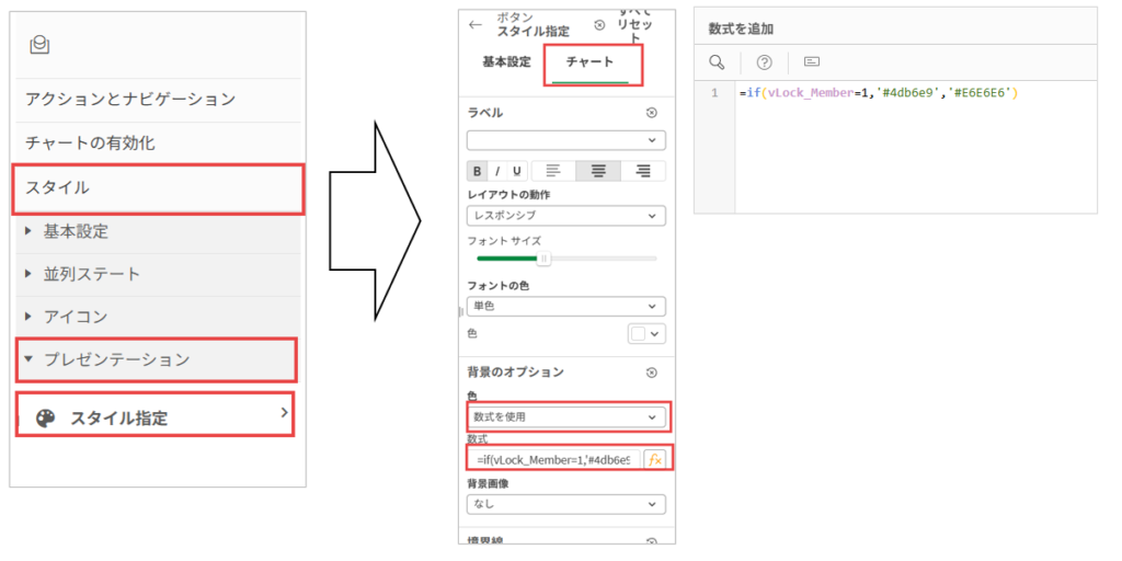 ONボタンを選択しスタイル→プレゼンテーション→スタイル指定をクリック→基本設定/チャート→チャートを選択し色の欄は数式を使用をドロップダウンから選択し、数式欄に「=if(vLock_Member=1,’#4db6e9′,’#E6E6E6′)」を設定します。選択時の時は明るい水色で未選択時は灰色を設定します。