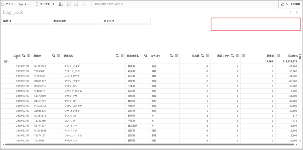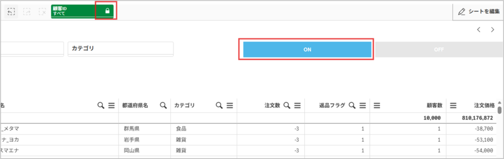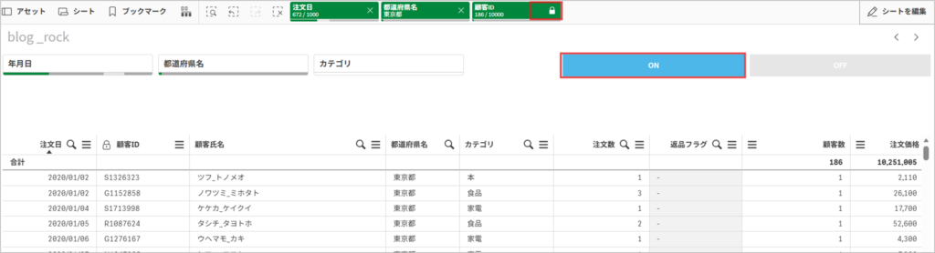 注文日や都道府県の選択をクリアしても、186名の顧客はロックされたまま他のシートへ遷移します。