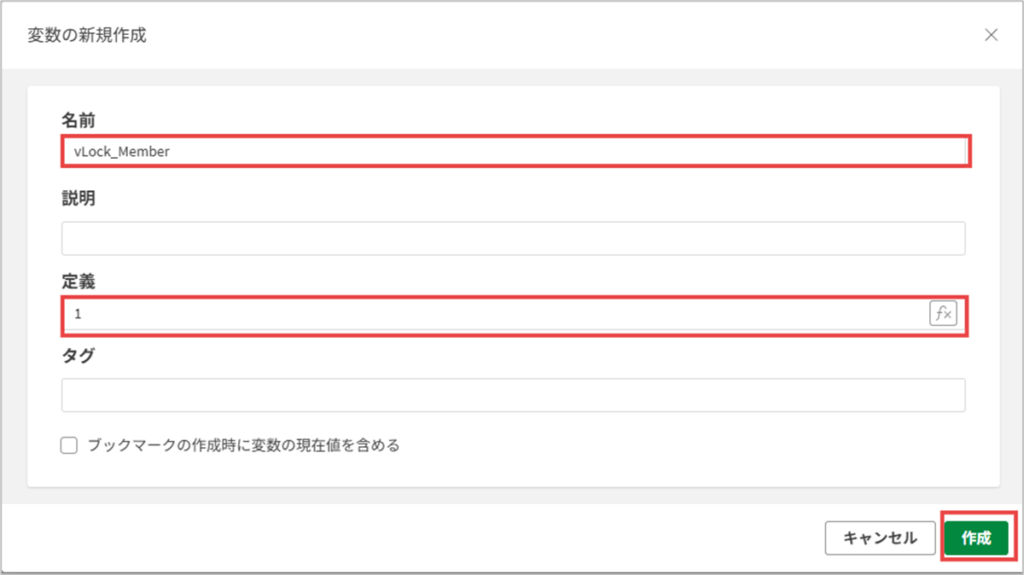 今回はボタン切替用変数をvLook_Memberと命名し、常時どちらかを選択状態にするため定義に、1を設定し作成ボタンをクリックします。