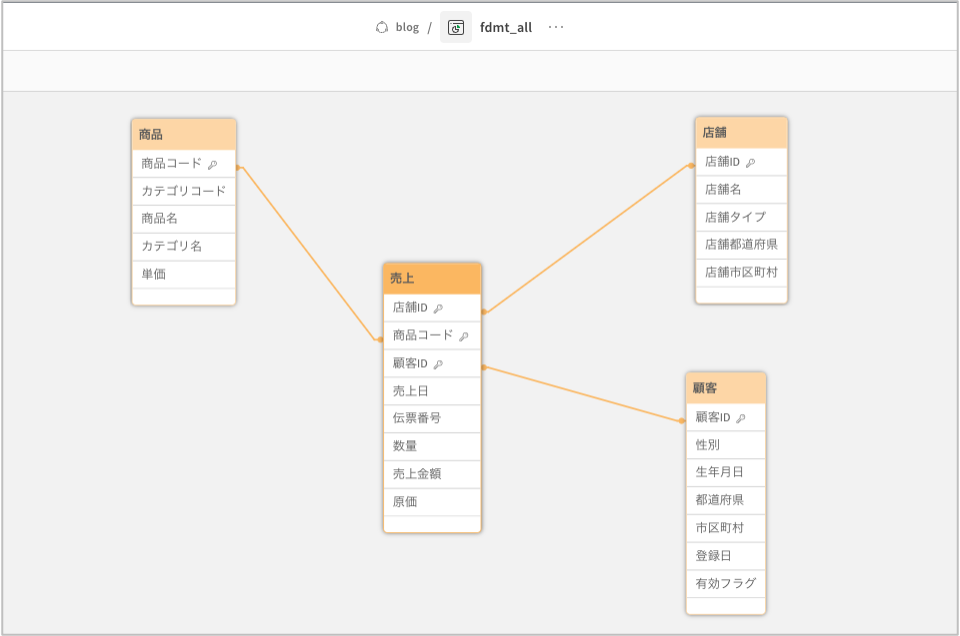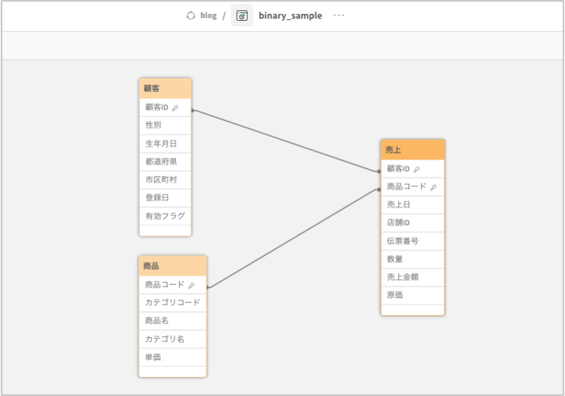 keeo_tablesのインラインロード分の下に取り込みたいテーブルを指定します(この例では、売上、商品、顧客になります)。