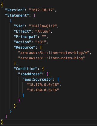 - 一方で、別リージョン(例:Qlik=東京、S3=大阪)にすると、 通信はパブリックインターネット経由となり、Qlikの外向きIP帯(18.179.0.0/16 など)が正しく評価されるため、 IP制限付きでも接続可能。