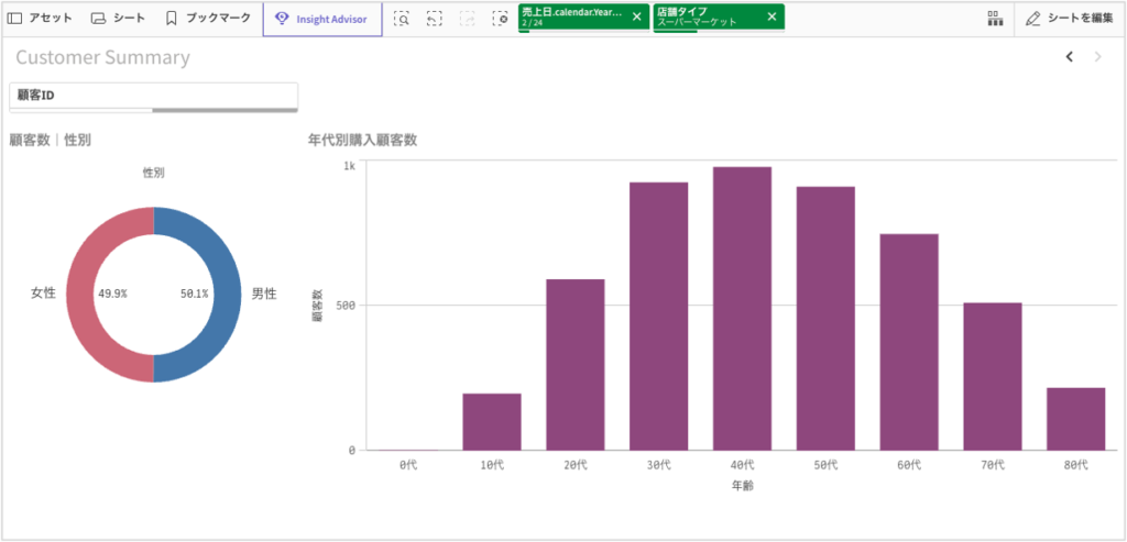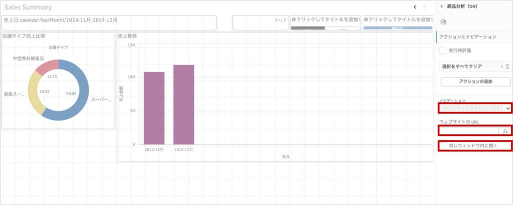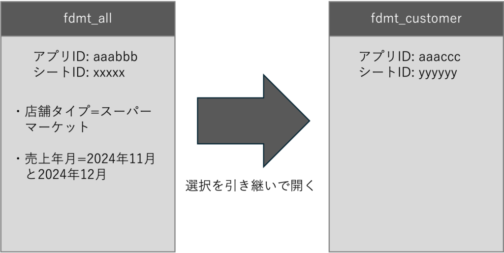 今回のシナリオは、fdmt_allという売上全体を分析するアプリからfdmt_customerという顧客を分析するアプリを開きますが、その際に店舗タイプと売上年月の選択状態を引き継いで、遷移するという内容です。