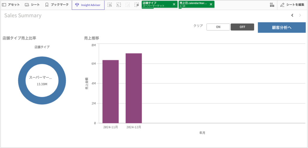店舗タイプと売上年月を選択した状態で[顧客分析へ]ボタンを押すと、以下のように顧客分析(fdmt_customer)が選択状態が保たれたまま開かれます。