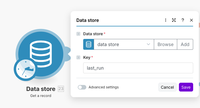 まず、Make.comでシナリオを新規作成し、モジュール「Data store — Get record」を追加します。
