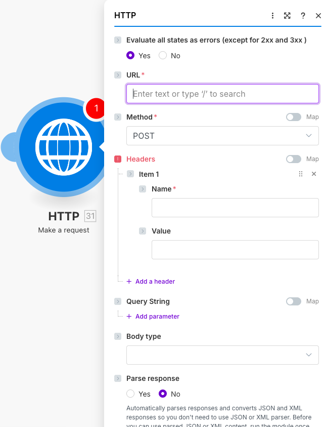 モジュール「HTTP —Make a request」を追加して、Qlik CloudのAutomationを呼び出します。