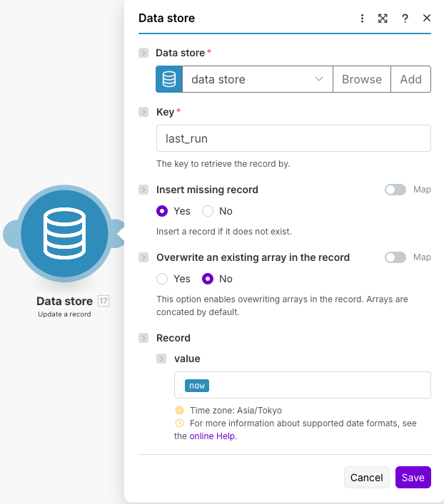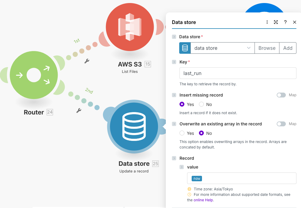 最後に、モジュール「Data store — Update a record」をシナリオに追加し、S3の検知条件に使う「前回の実行時刻」を更新するため、Data storeの「value」に実行日時が入るようにします。