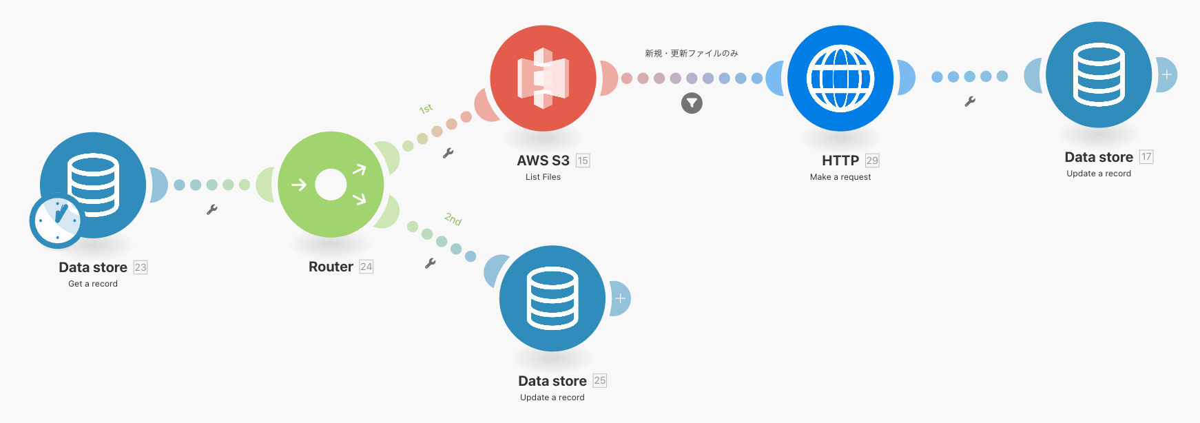 - Data Storeで取得した最終実行日時と、S3のファイルの更新日時を比較