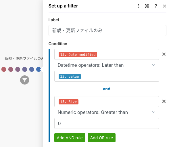 フィルターで、前回の実行日時とアップロードされた日時を比較し、前回の実行日時より後にアップロードされたファイルのみ通す条件を設定します。