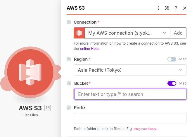 ここでは、対象バケットやフォルダを指定し、「Date modified」や「Size」などS3の情報を取得します。